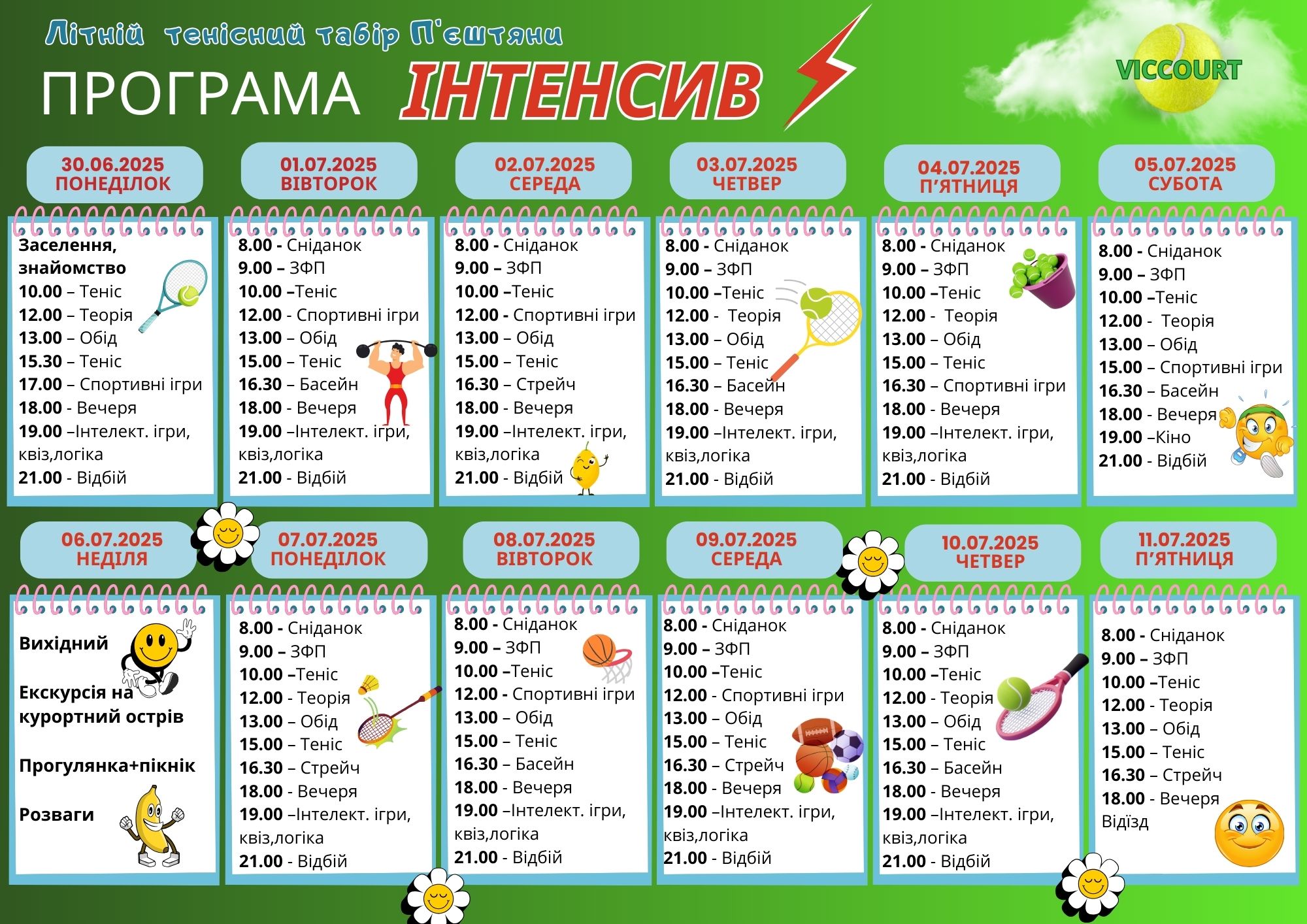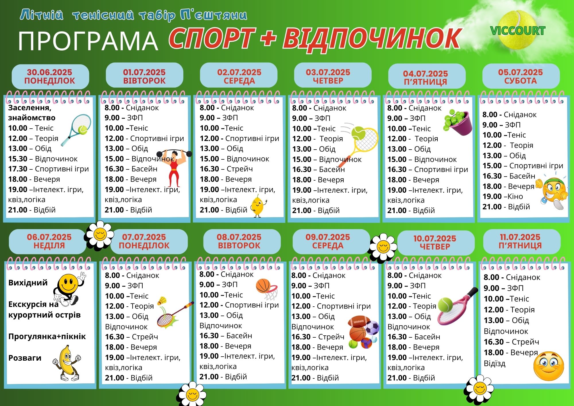 Запрошуємо юних спортсменів від 8-9 років будь-якого рівня підготовки провести незабутнє літо в компанії однодумців, під керівництвом найкращих тенісних тренерів Європи!